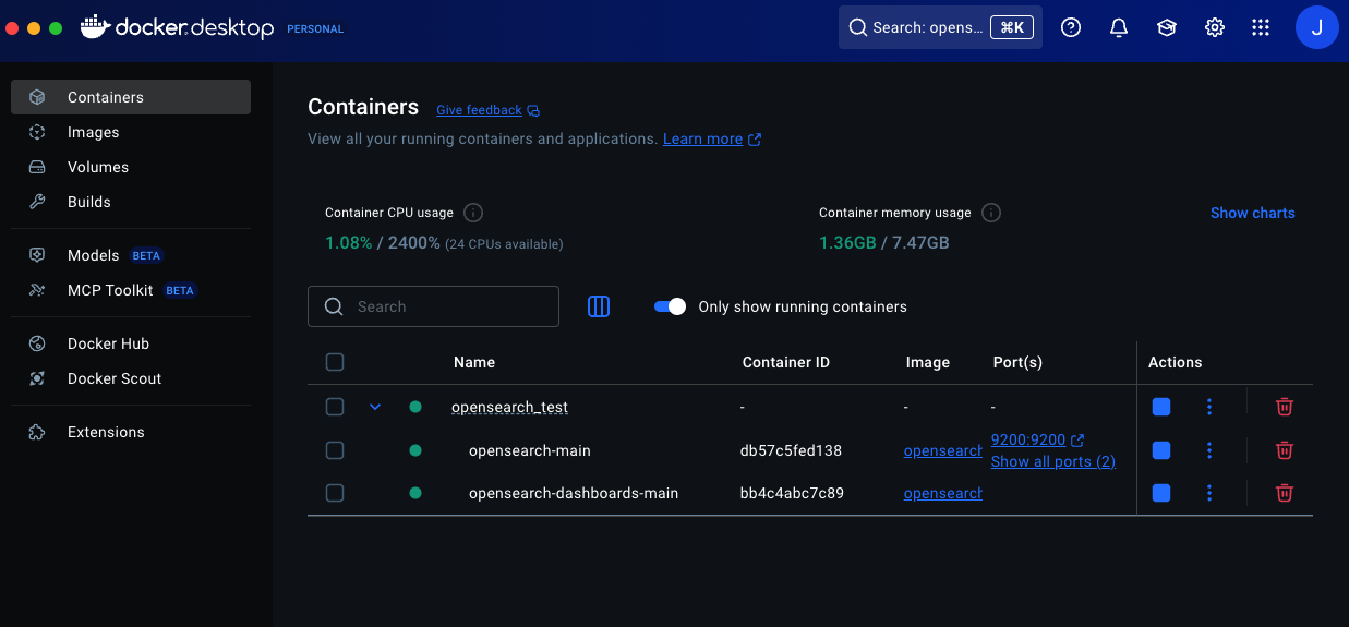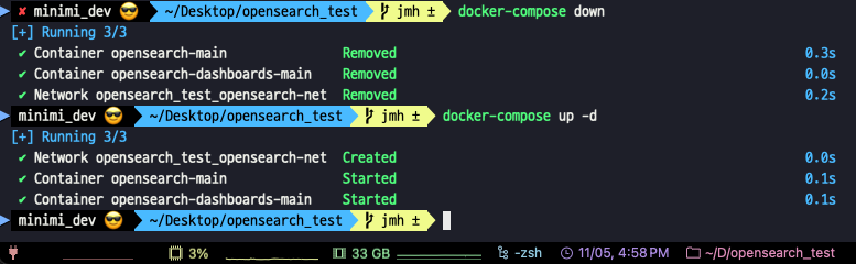 이처럼 손쉽게 로컬에서 오픈서치를 도커로 구성해서 오픈서치 테스트를 해볼 수 있는 점이 가장 좋은 것 같습니다